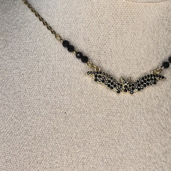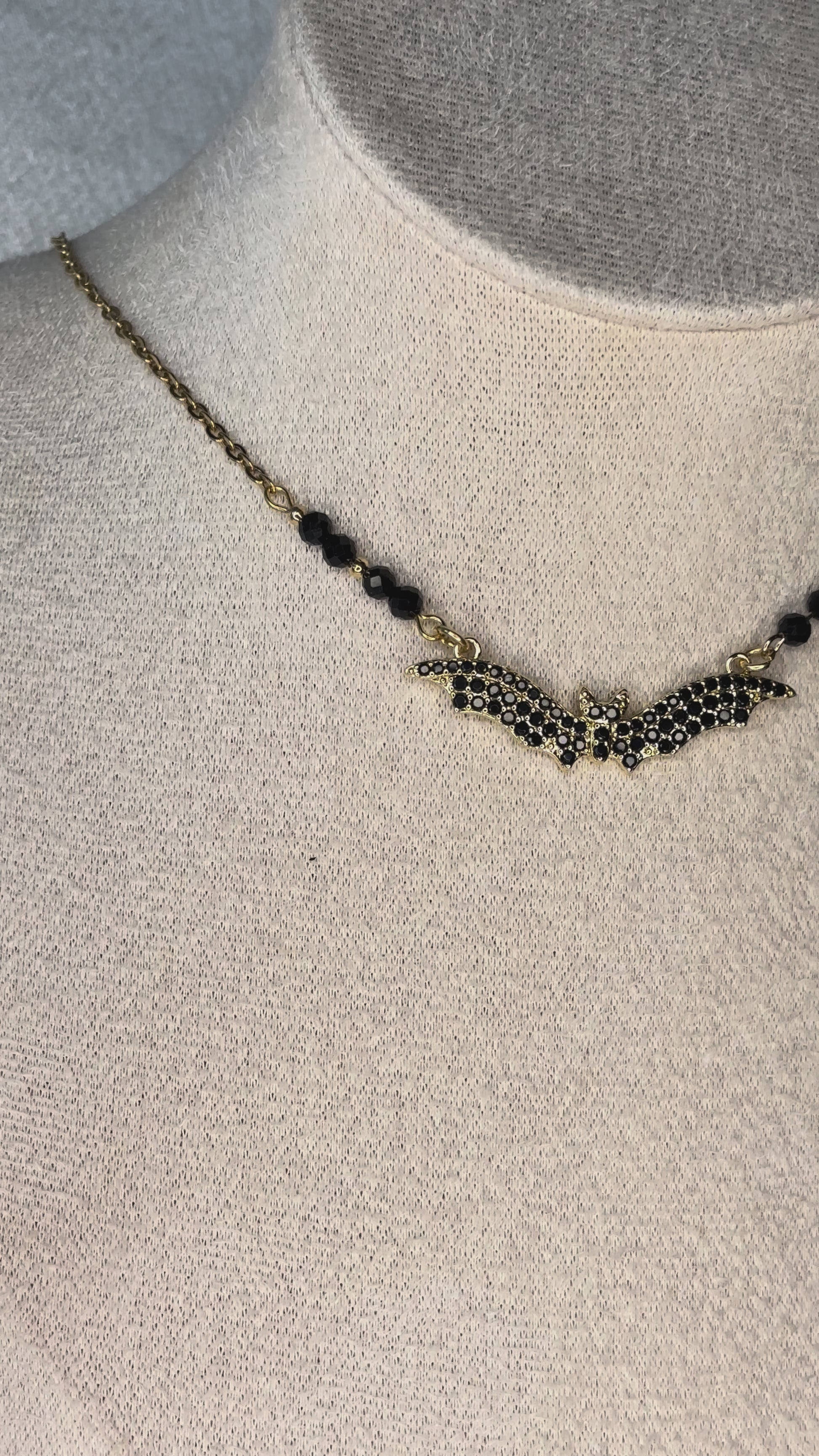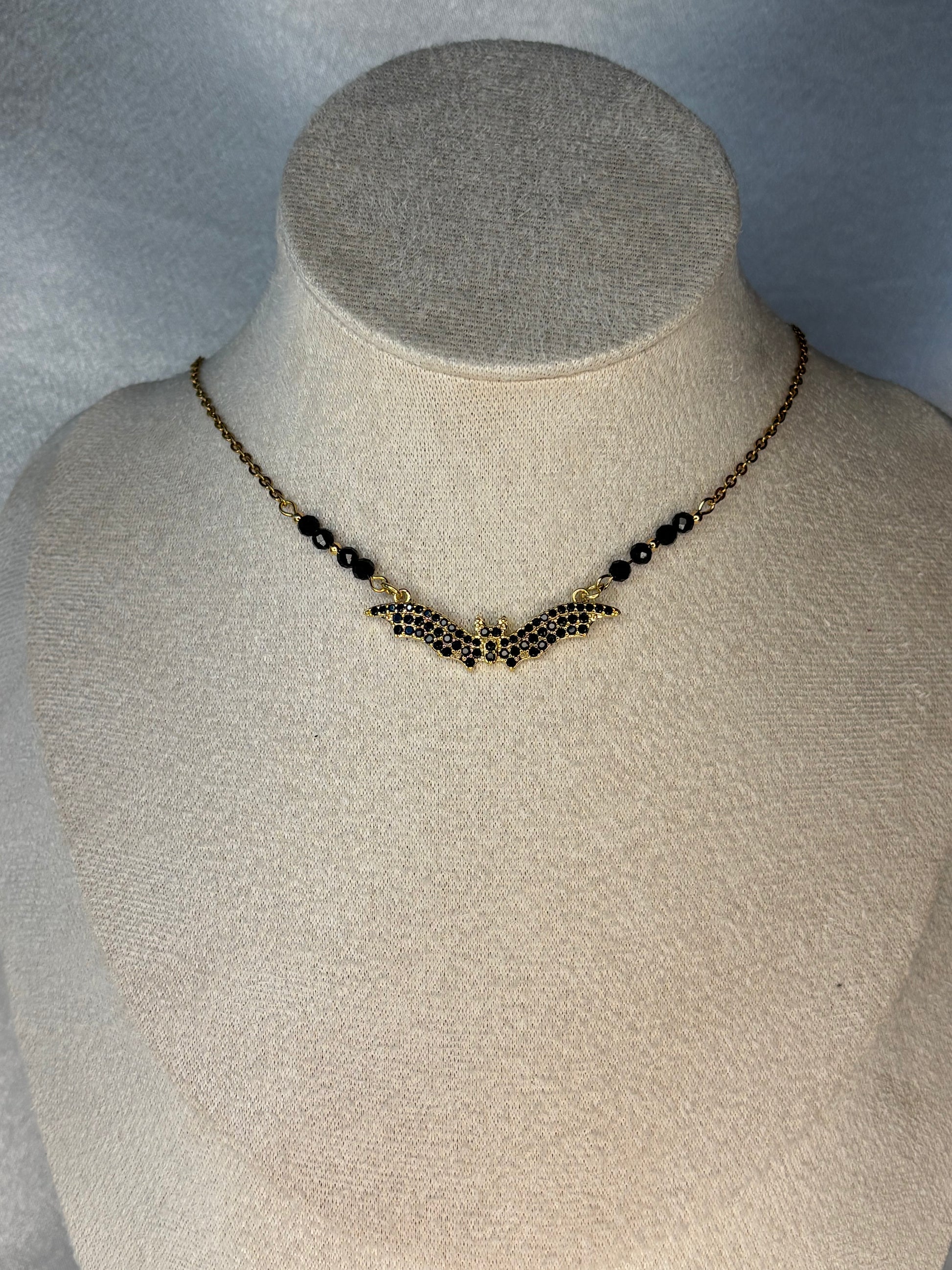 Gefertigt aus 18K vergoldetem Edelstahl mit facettierten Turmalin-Steinen und einem detailreichen Fledermaus-Anhänger (18K vergoldeter Edelstahl), vereint diese Kette Eleganz mit mystischer Symbolik.