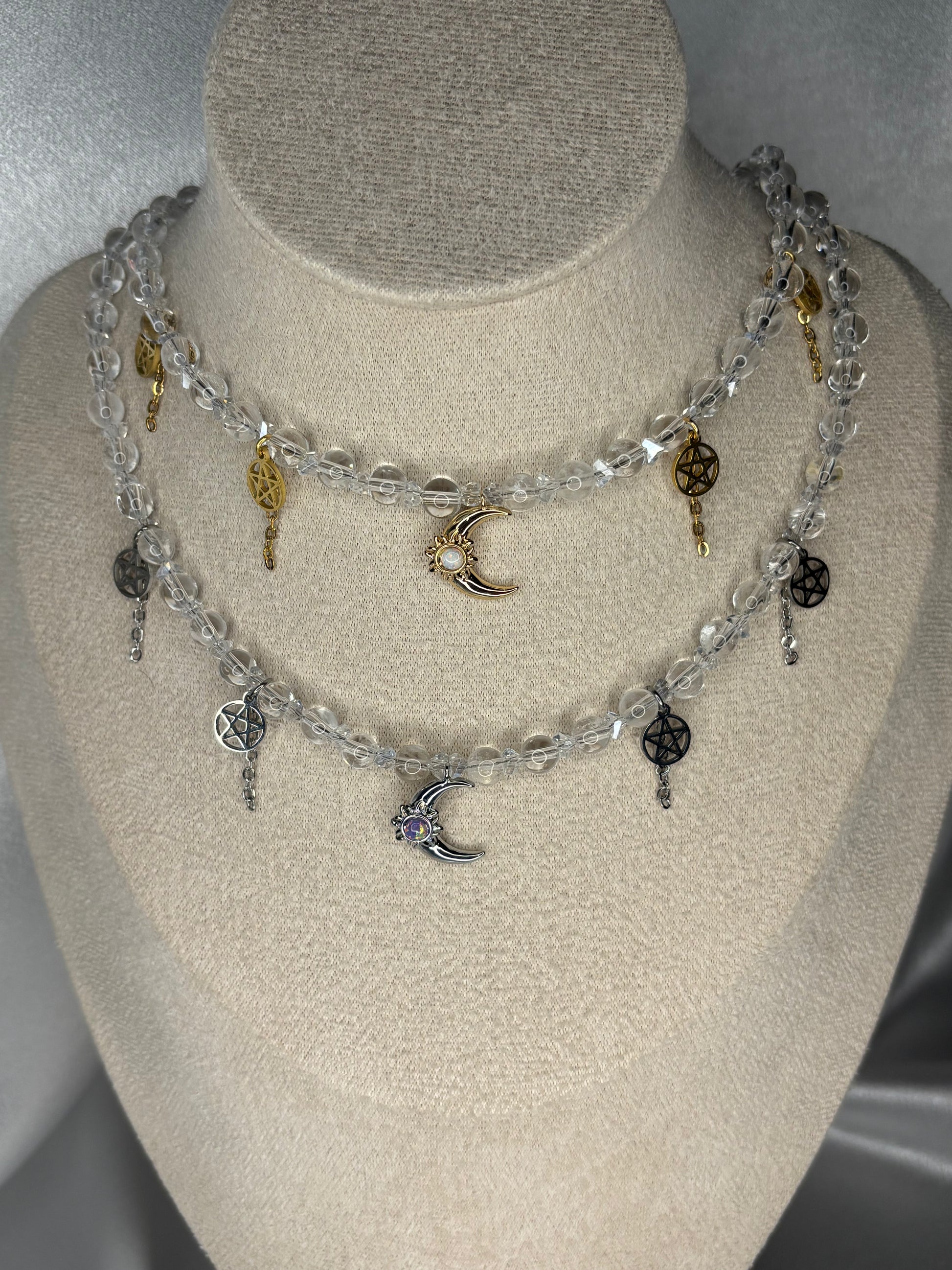 Fein geschliffener Bergkristall und funkelnde österreichische Glassplitter verleihen dieser Kette ein eisiges, kristallklares Strahlen – wie gefrorenes Mondlicht.