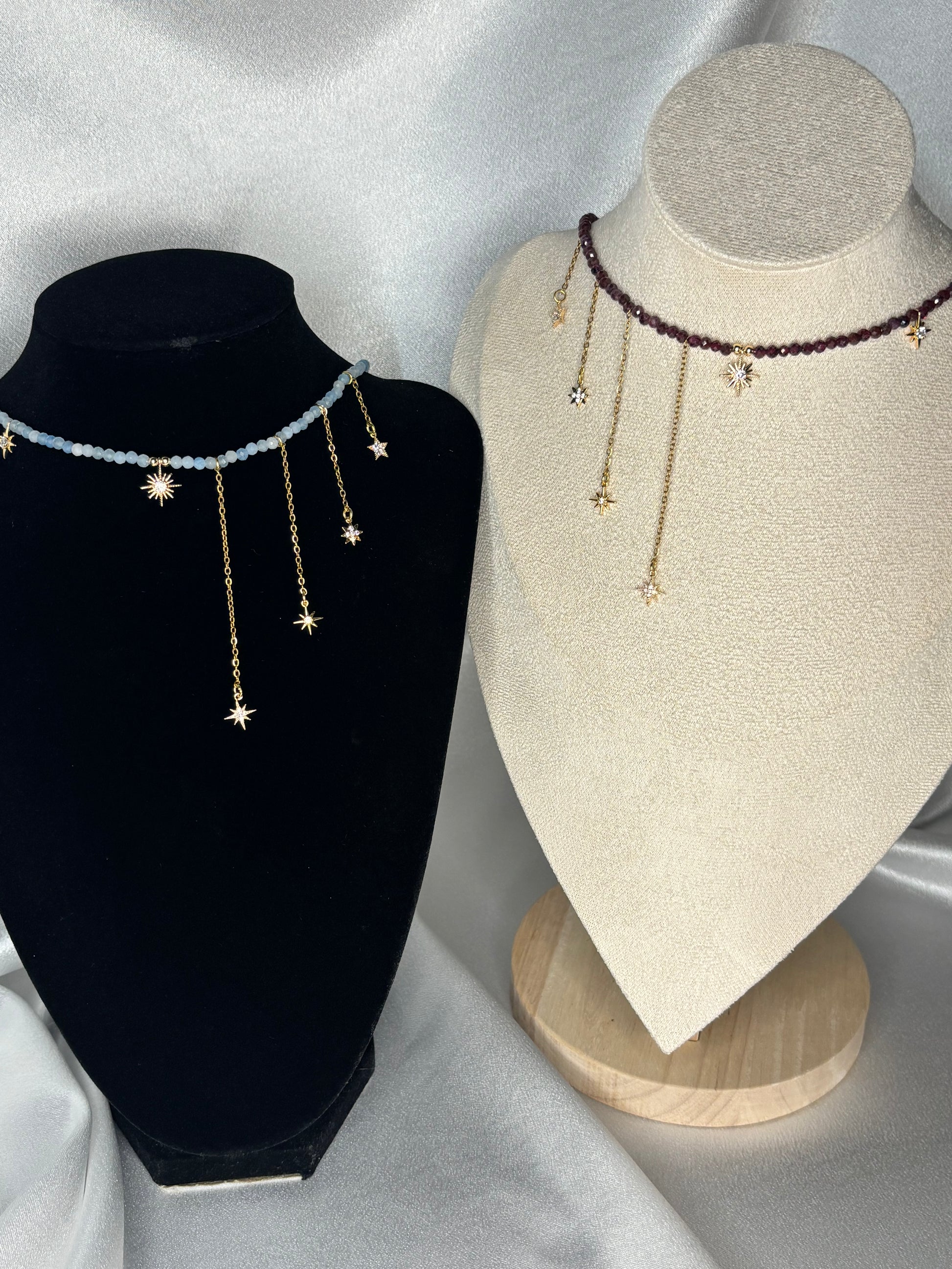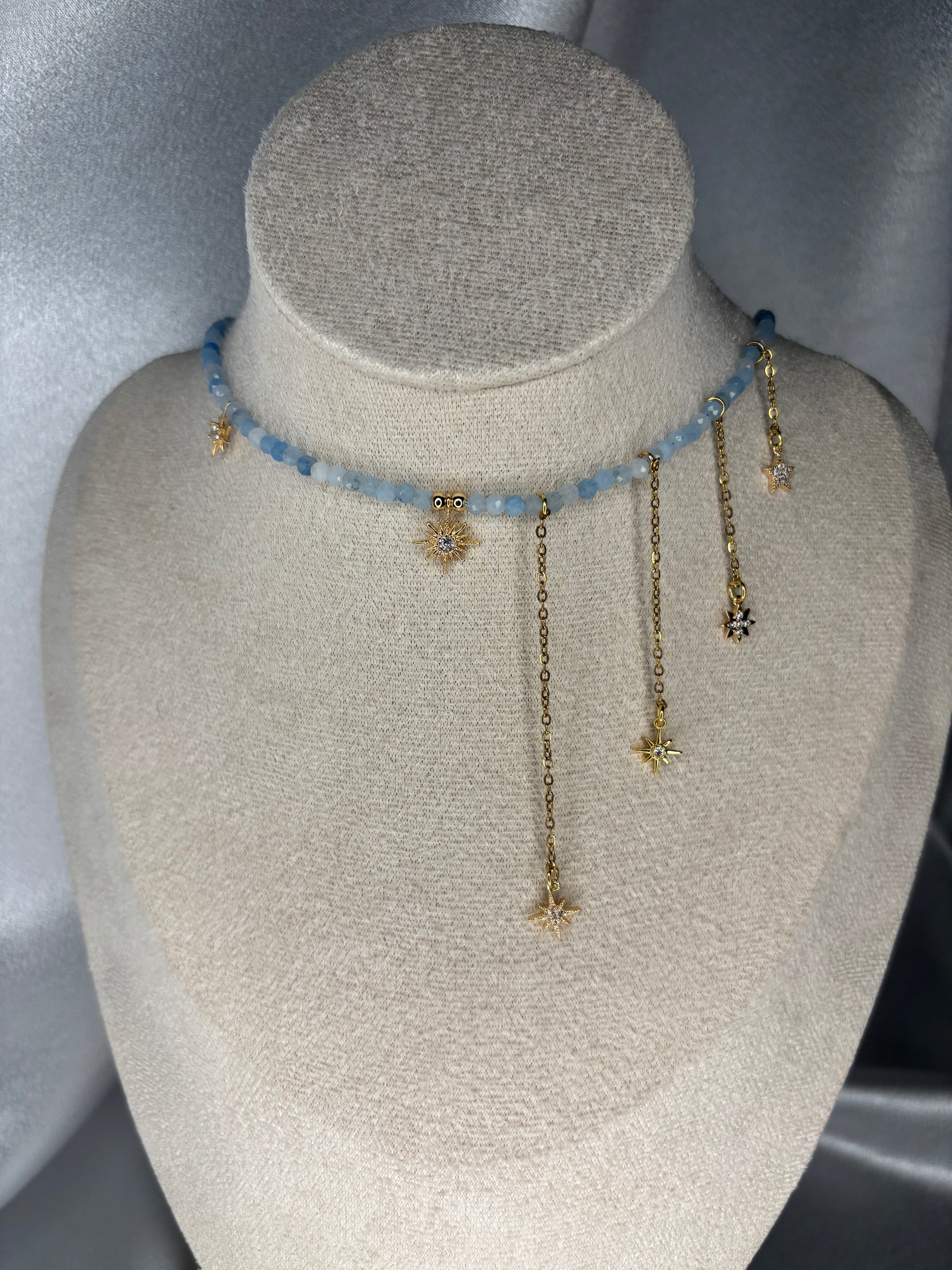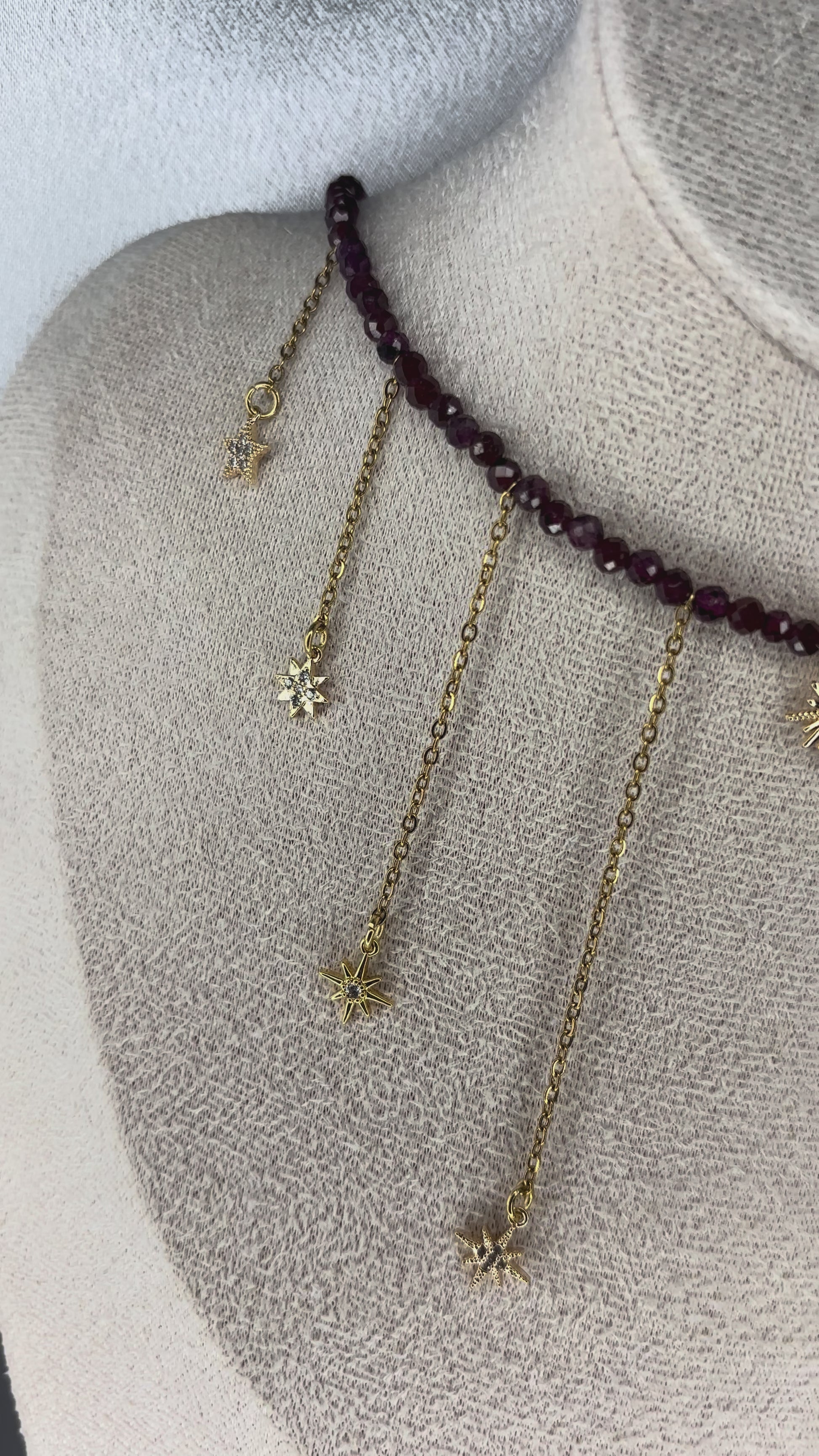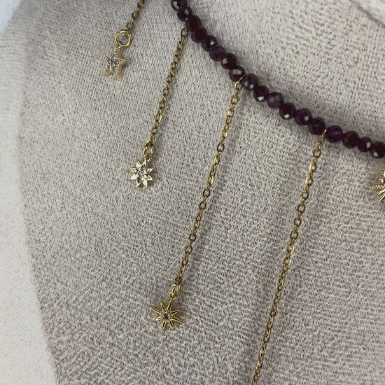 Zarte, goldfarbene Sternanhänger schaffen ein strahlendes, himmlisches Design und verleihen dem Schmuckstück eine geheimnisvolle Eleganz.