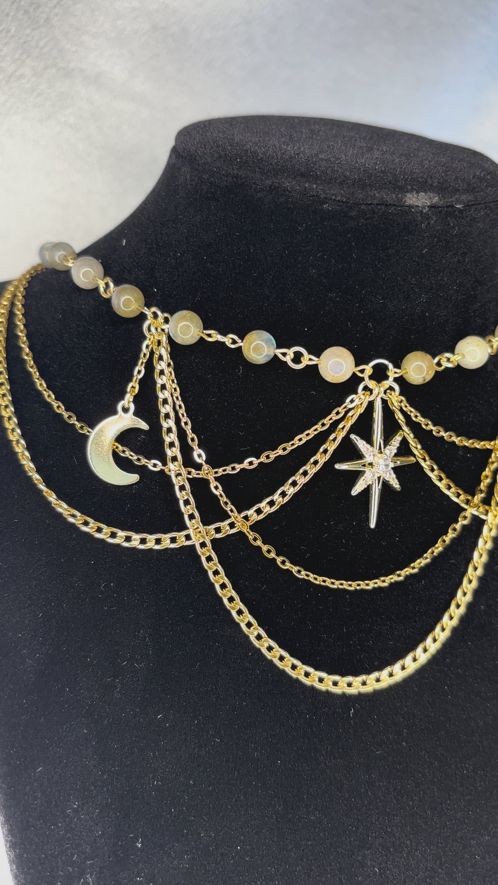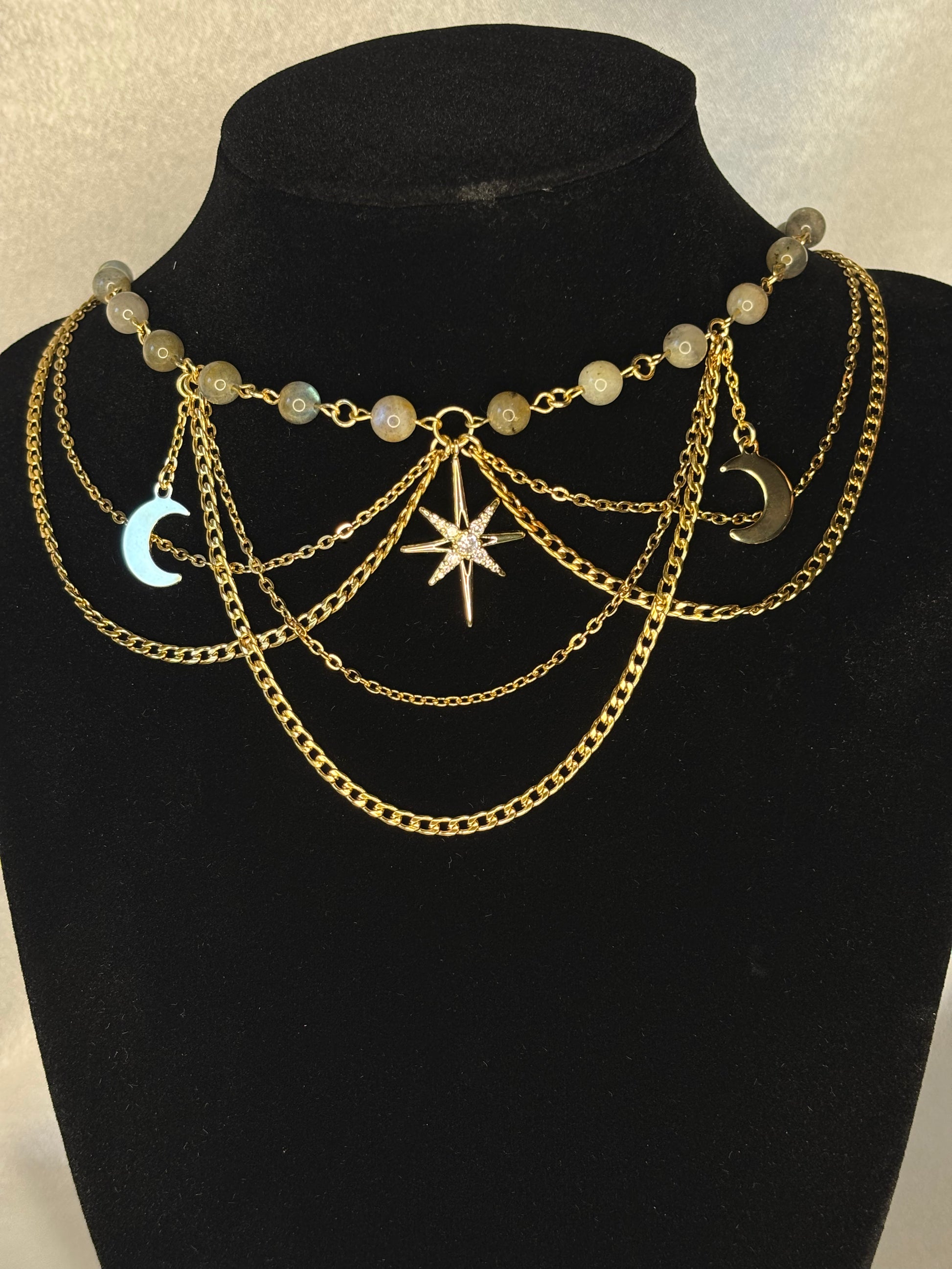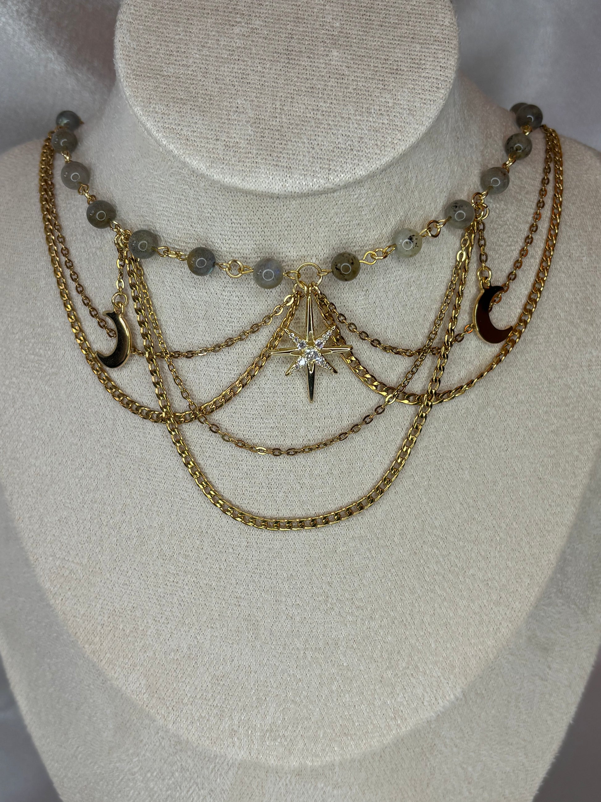 Gefertigt aus schimmerndem Labradorit oder Amethyst, symbolisiert diese Kette Schutz, Intuition und die Magie der Dunkelheit. Die filigranen Ketten aus Edelstahl oder 18K vergoldetem Edelstahl schmiegen sich in sanften Wellen um den Hals, während Mondsichel- und Sternanhänger (Messing 18k vergoldet) die geheimnisvolle Energie der Nacht verkörpern.