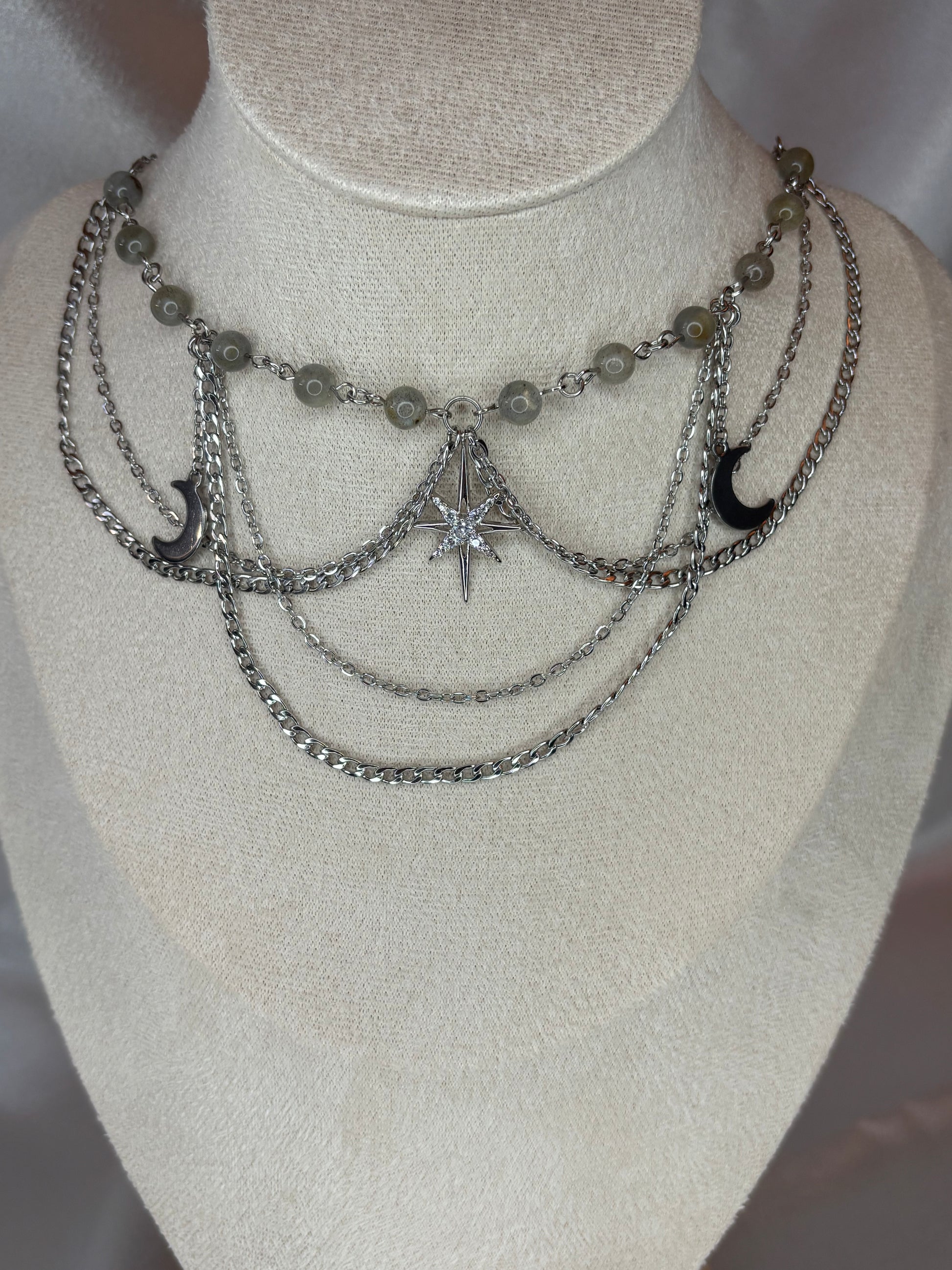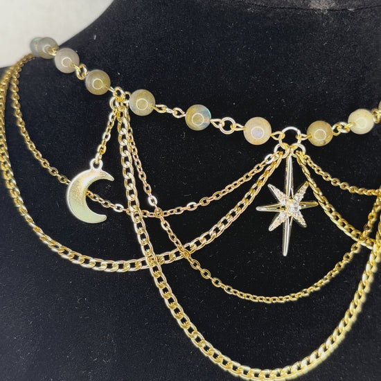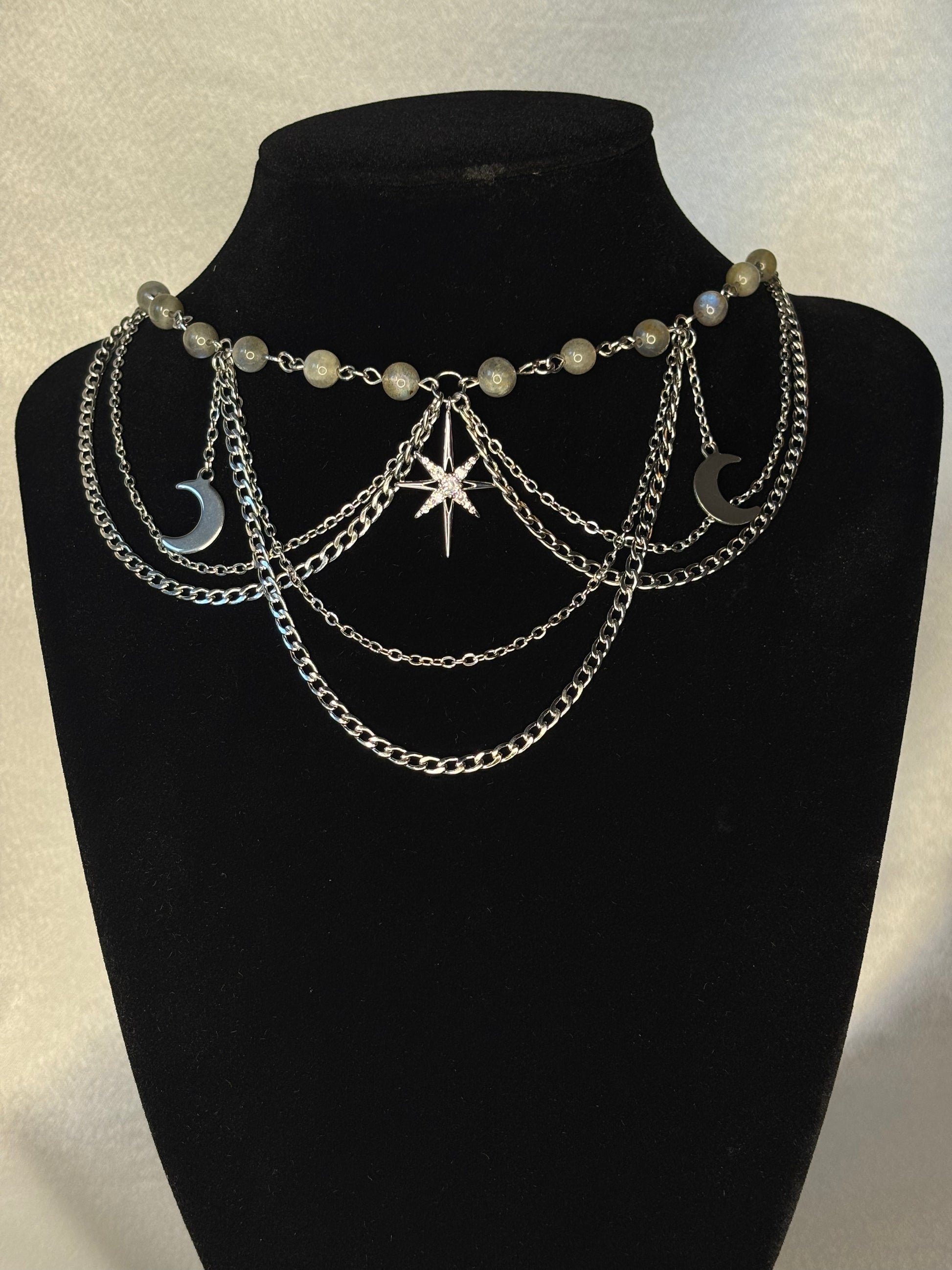 Gefertigt aus schimmerndem Labradorit oder Amethyst, symbolisiert diese Kette Schutz, Intuition und die Magie der Dunkelheit. Die filigranen Ketten aus Edelstahl oder 18K vergoldetem Edelstahl schmiegen sich in sanften Wellen um den Hals, während Mondsichel- und Sternanhänger (Messing 18k vergoldet) die geheimnisvolle Energie der Nacht verkörpern.