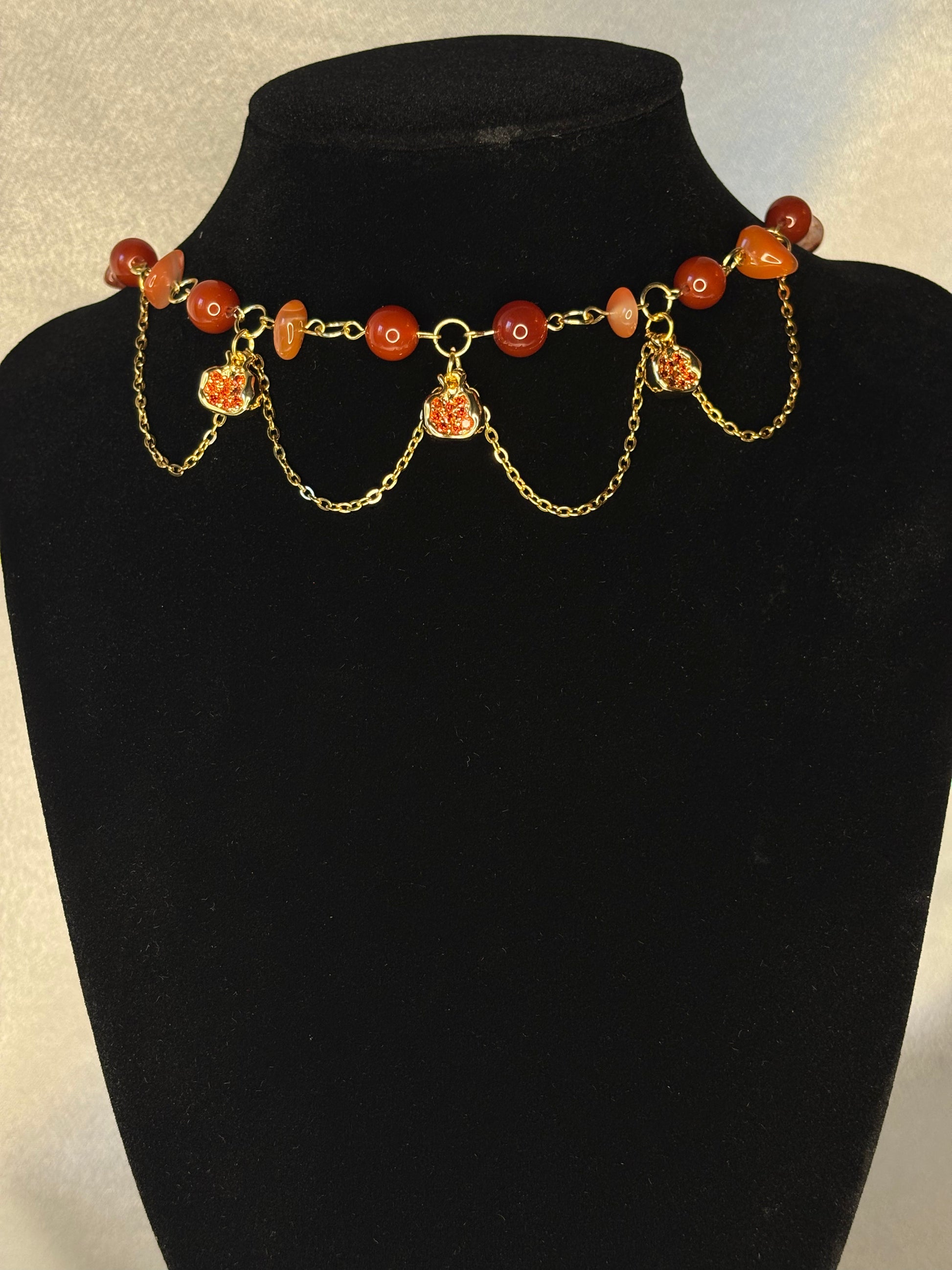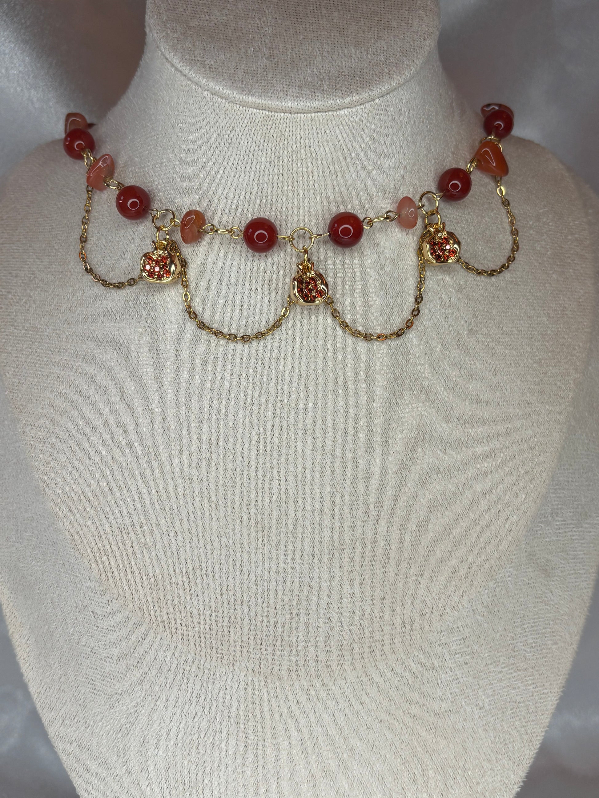 Die zarten 18K vergoldeten Edelstahlketten und die Granatapfel-Anhänger symbolisieren Fruchtbarkeit, Transformation und die Balance zwischen Licht und Dunkelheit.