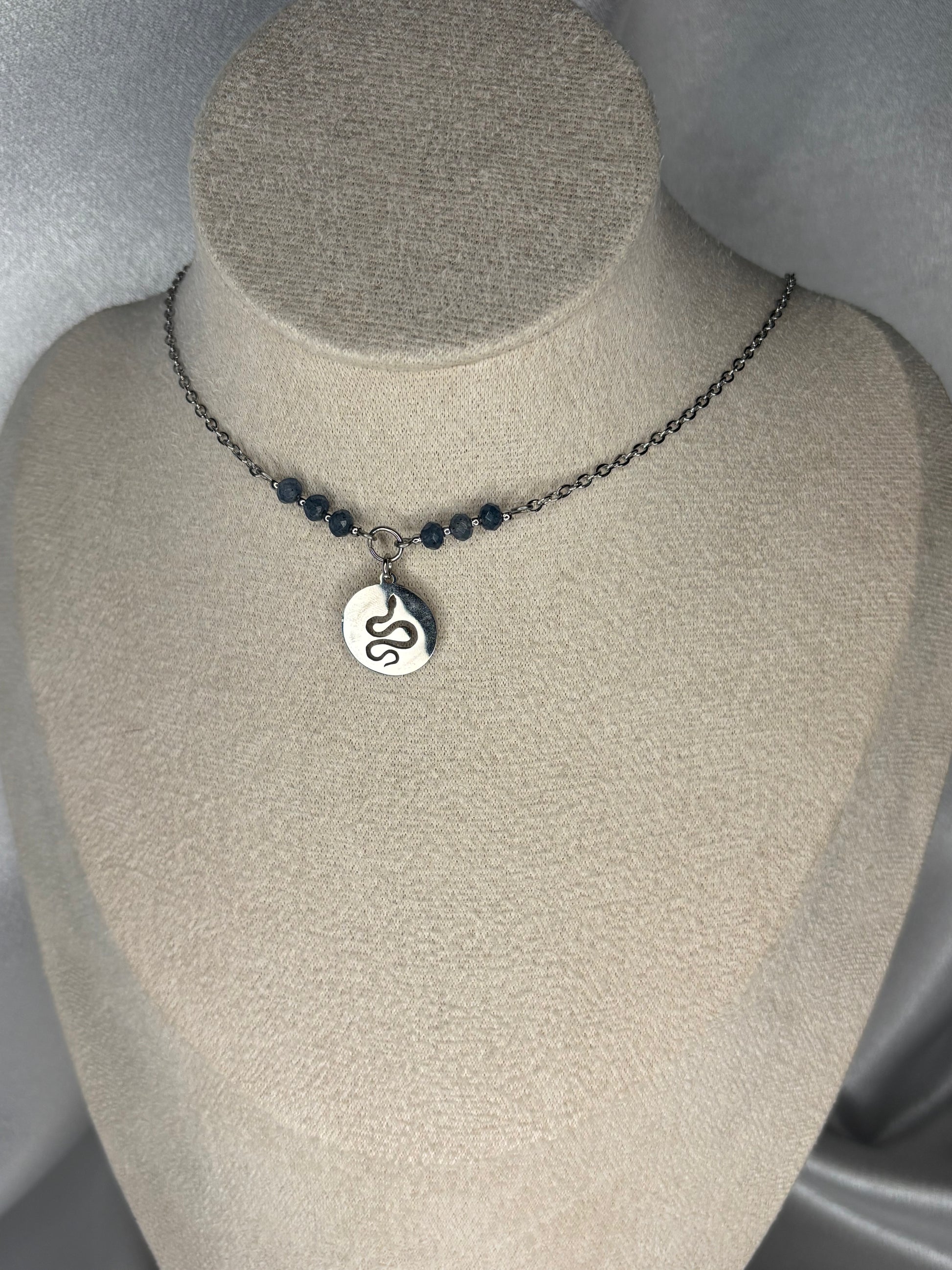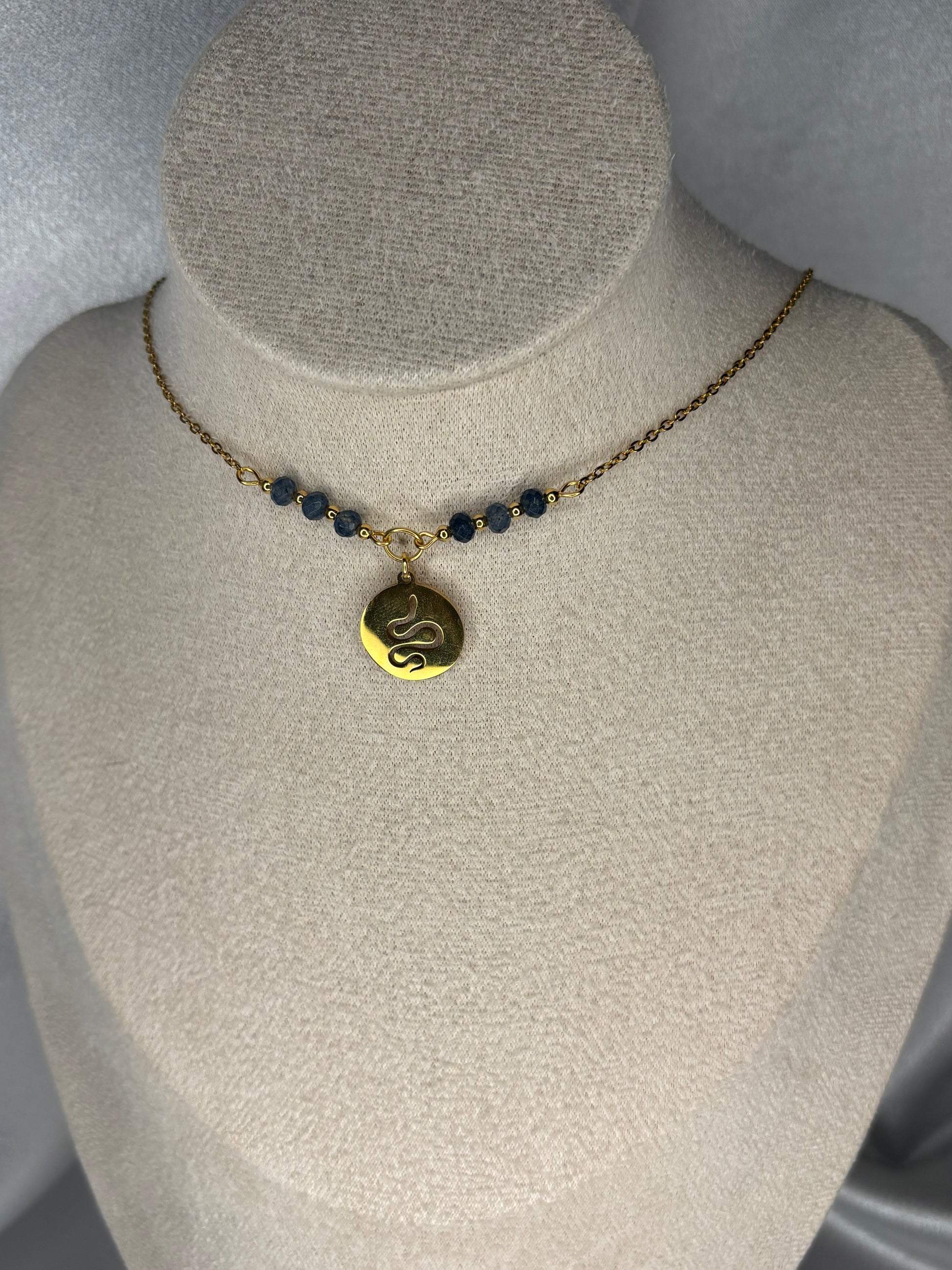 Im Zentrum steht ein runder Anhänger mit Schlangenmotiv – Sinnbild für Transformation, Schutz, Weisheit und innere Stärke.