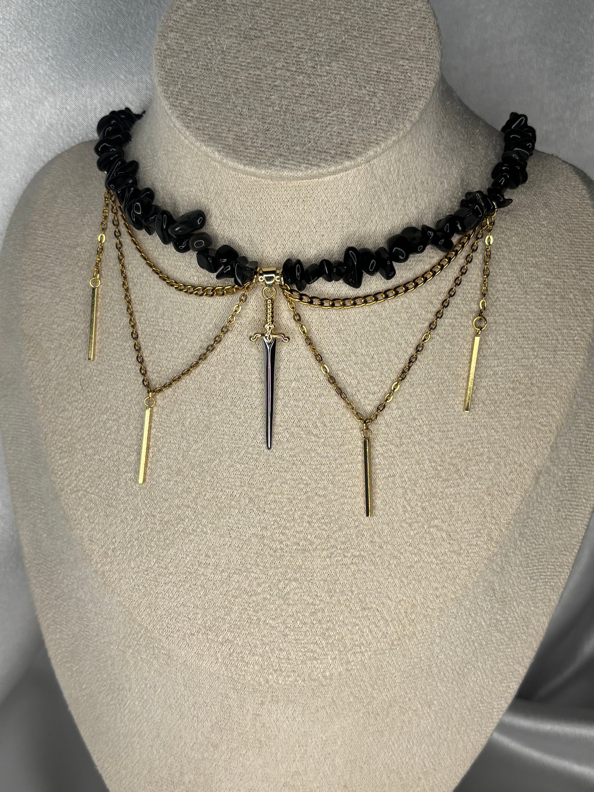 Im Zentrum steht ein feiner Schwert-Anhänger, Symbol für Mut, Entschlossenheit und die Fähigkeit, sich energetisch zu verteidigen.