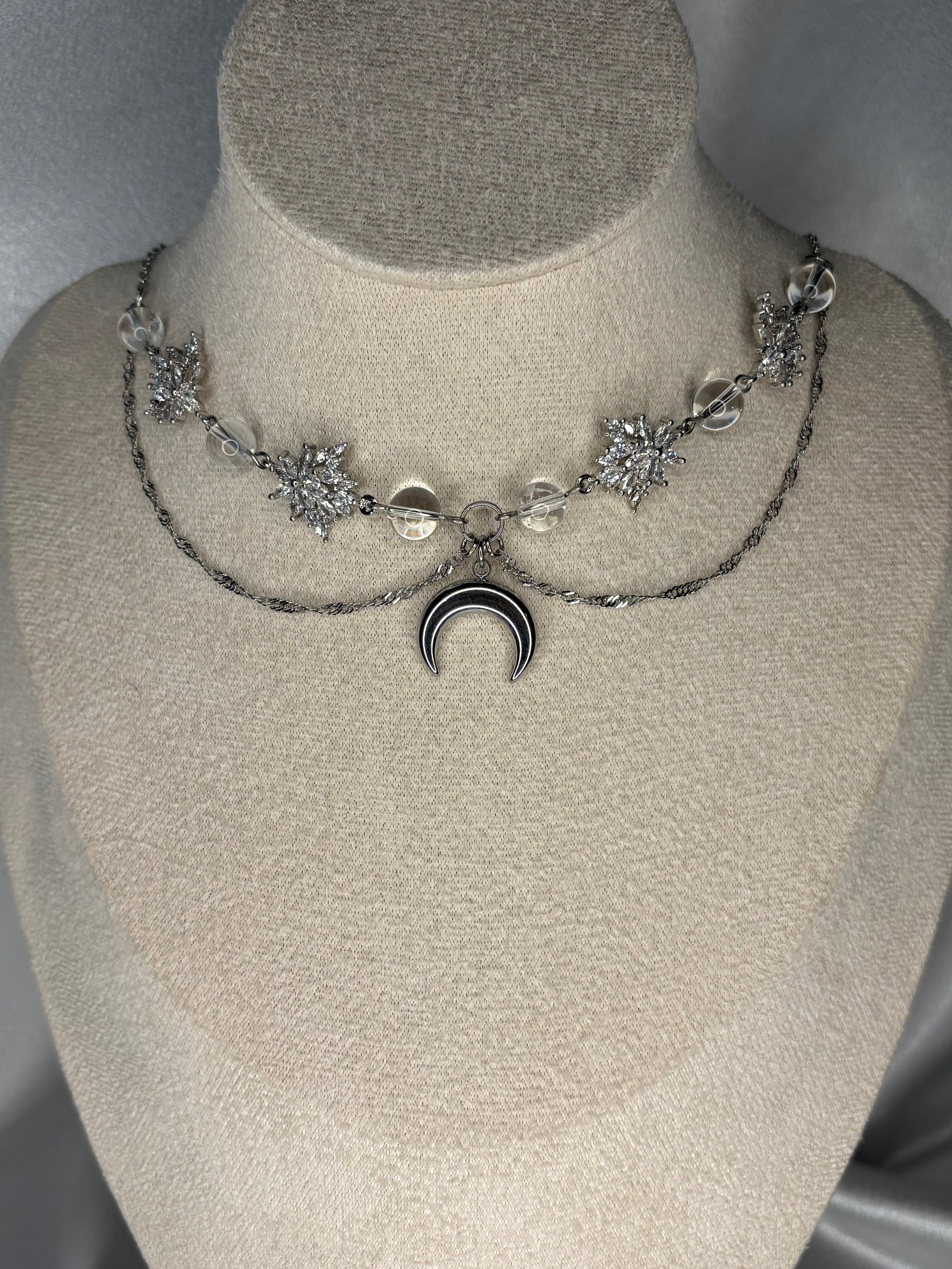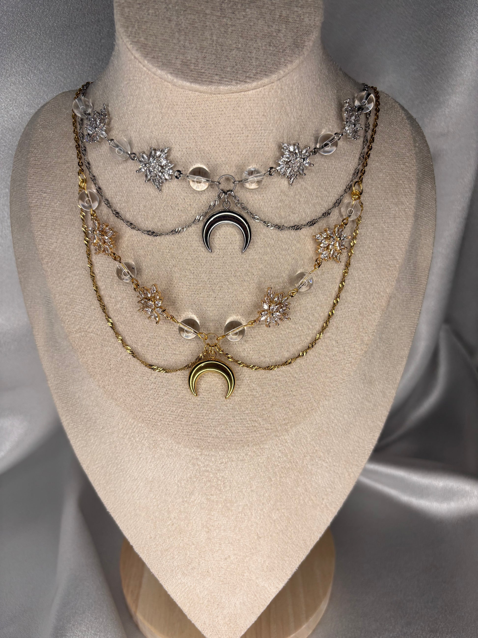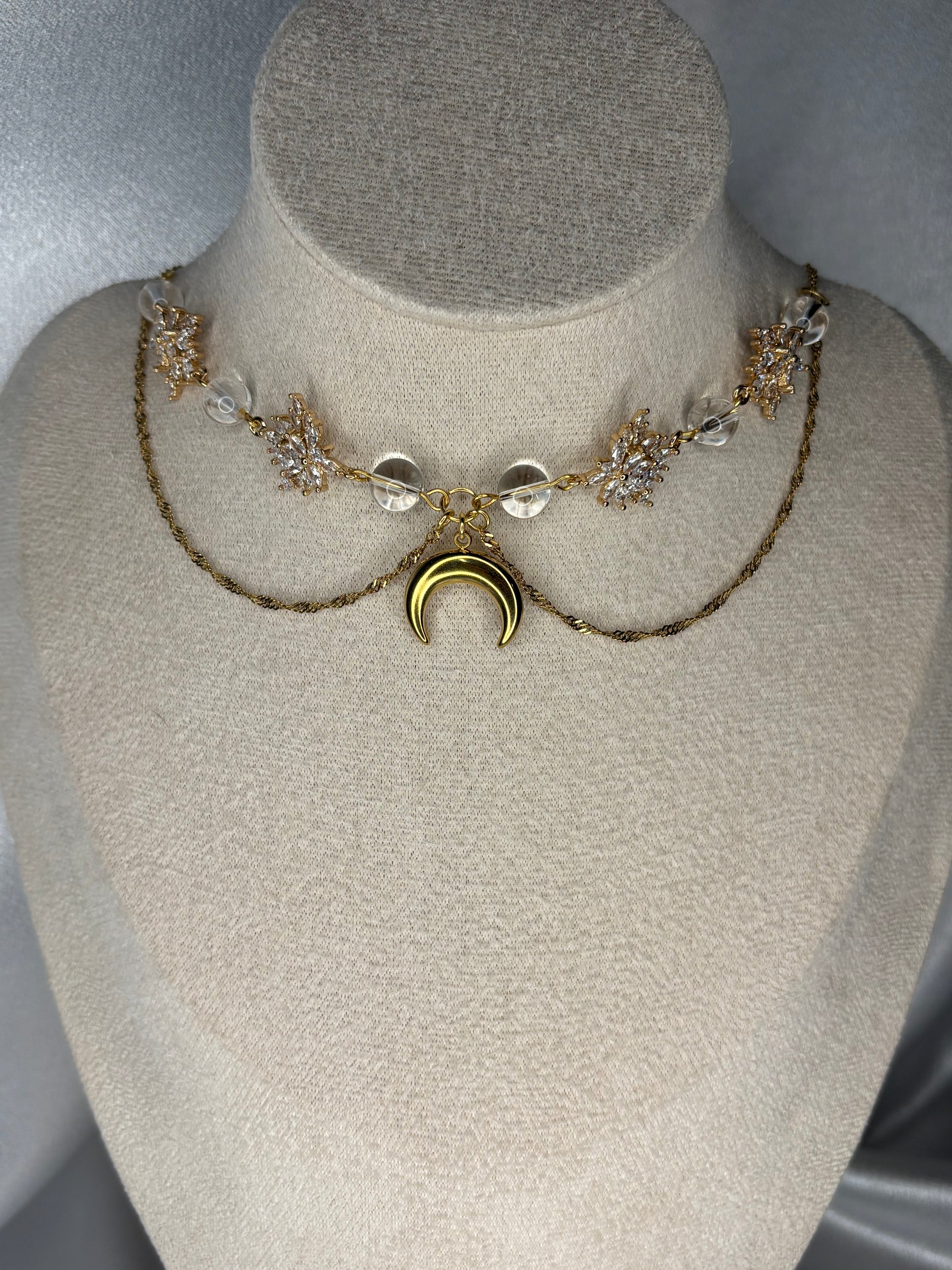 Klarer Bergkristall trifft auf funkelnde Strass-Elemente und einen zarten Mond-Anhänger, der sanfte, feminine Mondkraft symbolisiert.